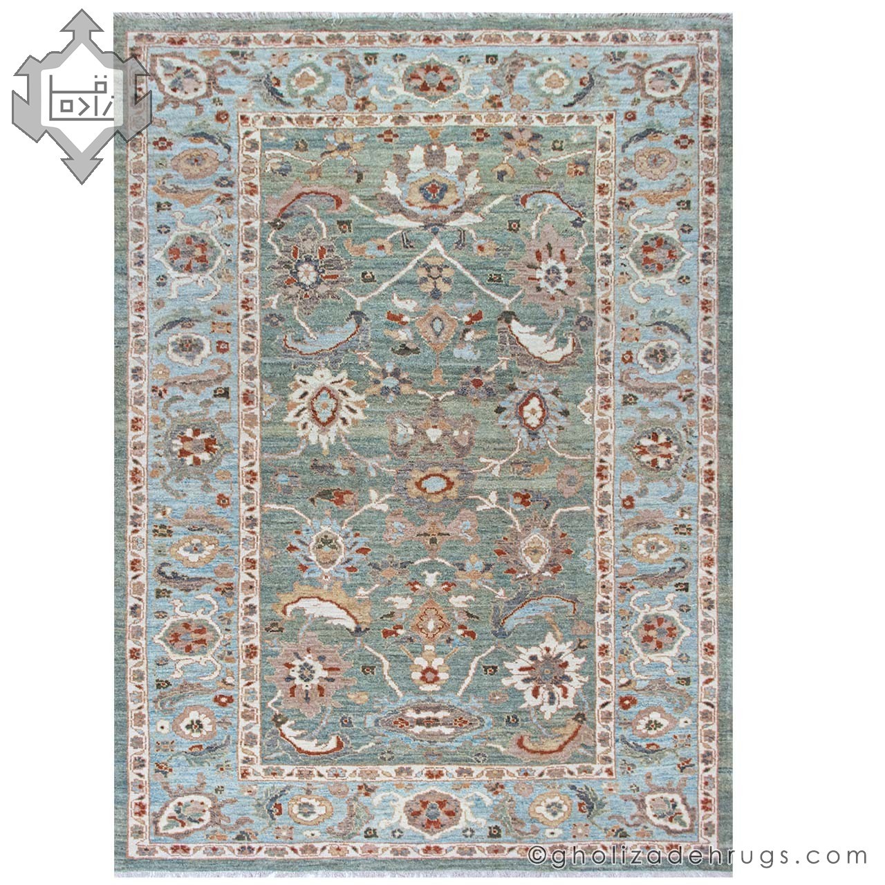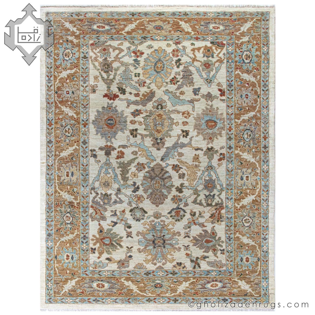 This handwoven Sultanabad rug features a warm cream field with a sky-blue border—one of the most popular and timeless color combinations of Sultanabad rugs. Hand-spun wool, natural vegetal dyes, and the Gholizadeh brand certificate make it a safe and confident choice for any interior style.