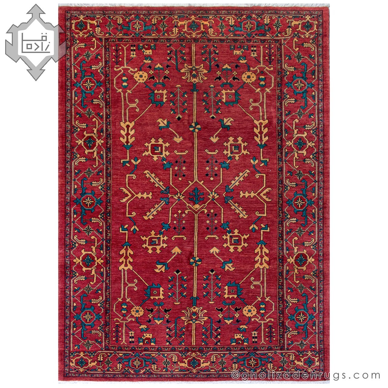 This Heriz handmade rug features a rich madder red tone, traditionally derived from the madder root, a color long associated with prestige, ceremony, and architectural grandeur in Persian carpets.