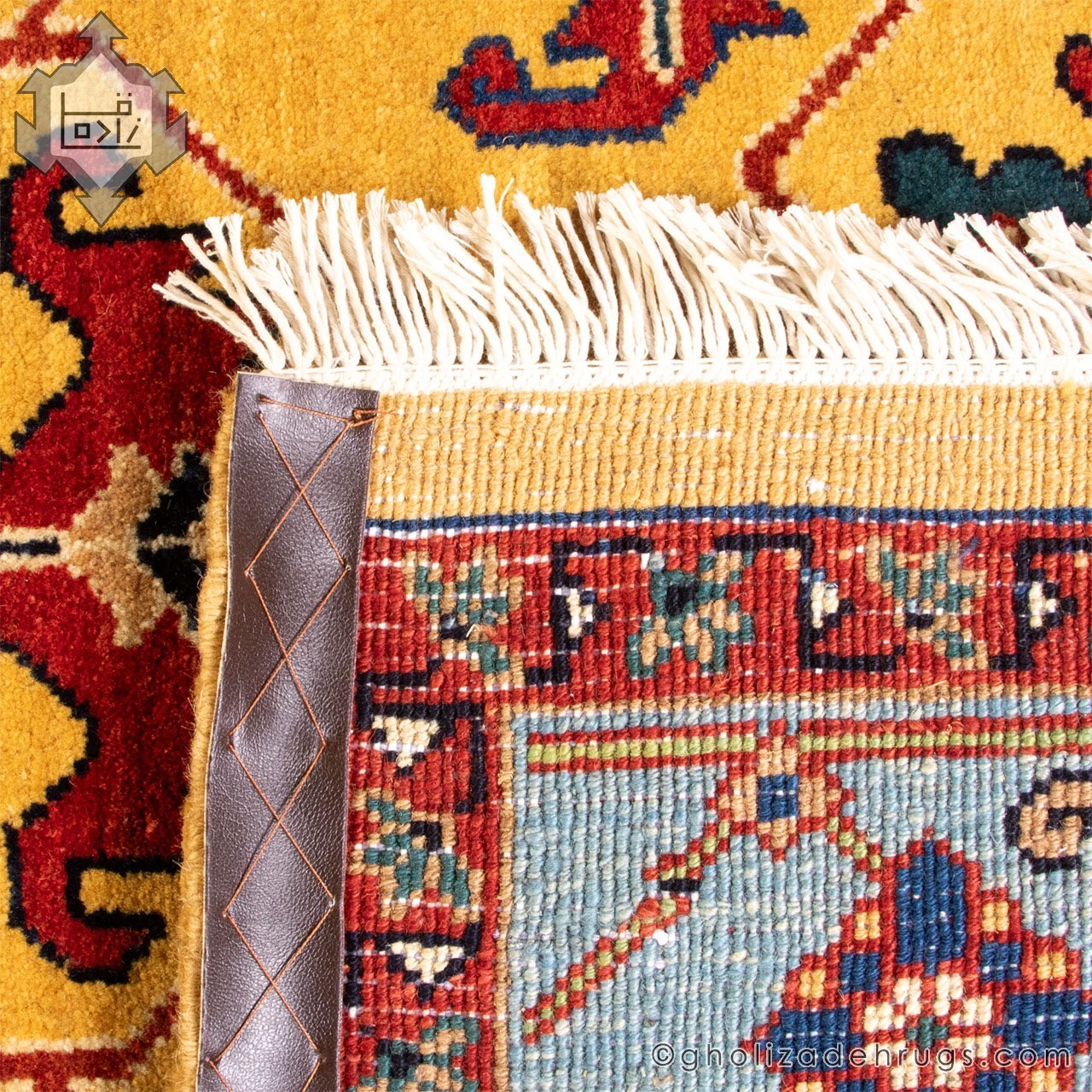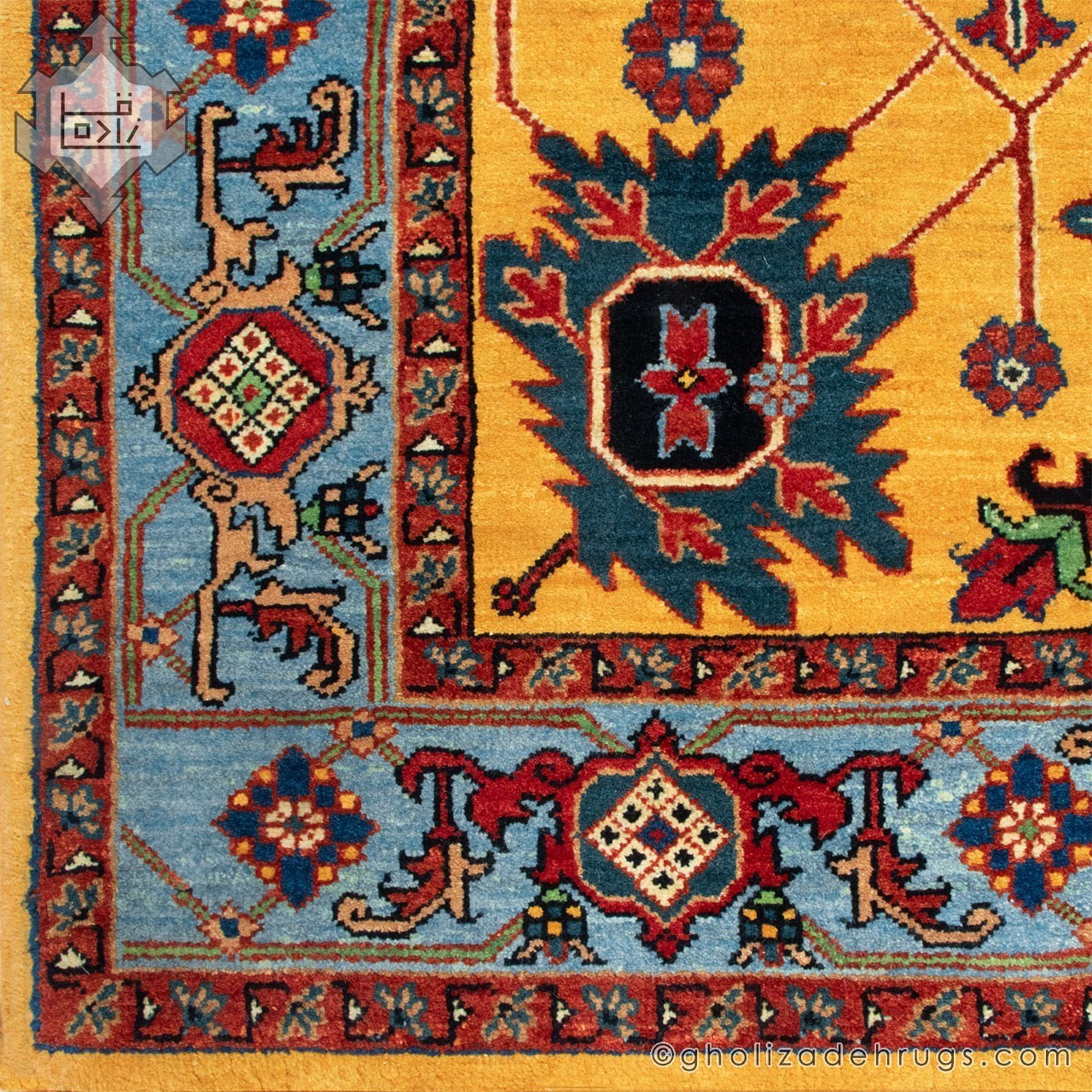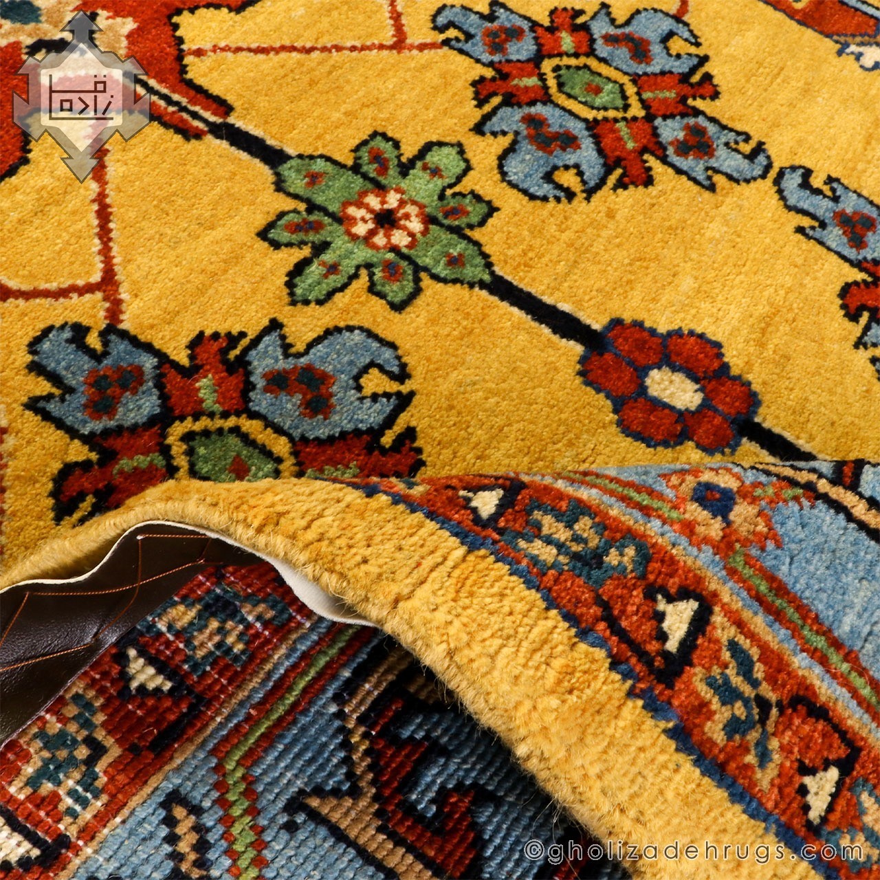 This handmade Heriz rug features a Turkish (symmetrical) knot, long-lasting vegetable dyes, and a highly popular near-4 sqm size. The yellow and blue color combination, known as complementary colors, creates a balanced yet vibrant visual impact.