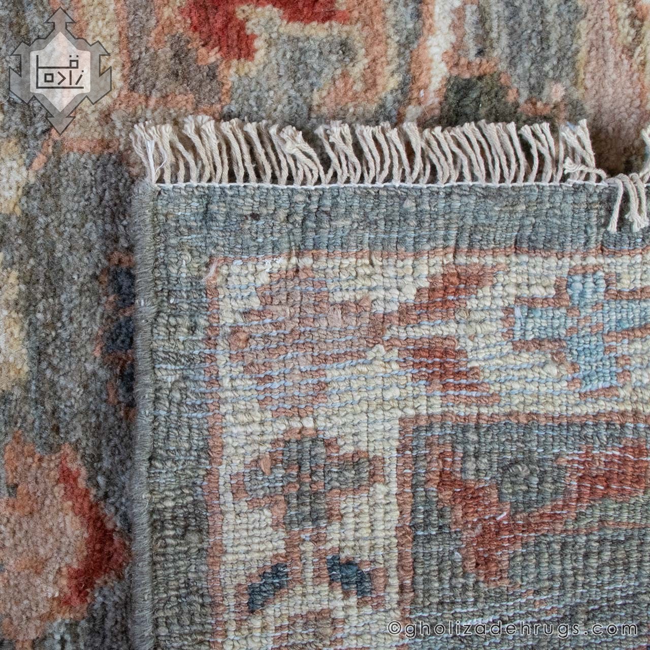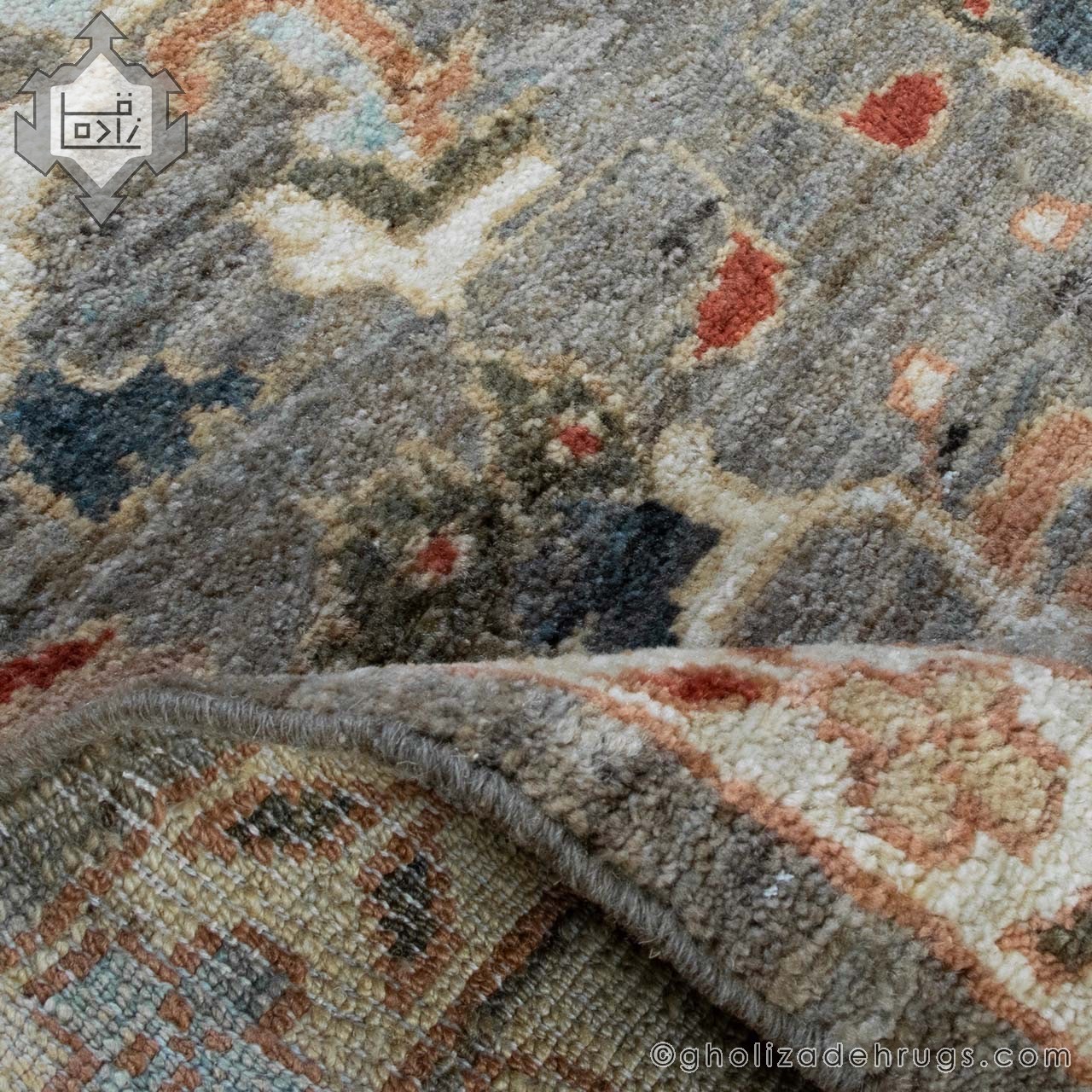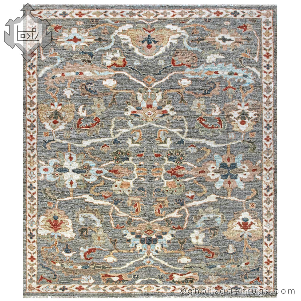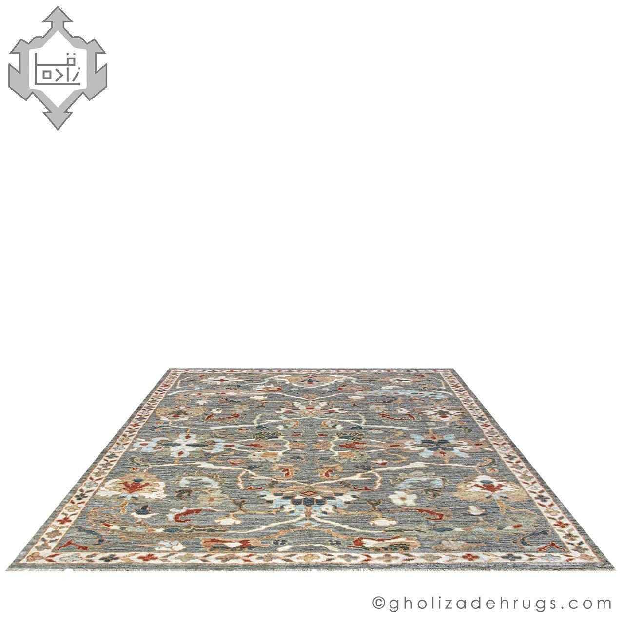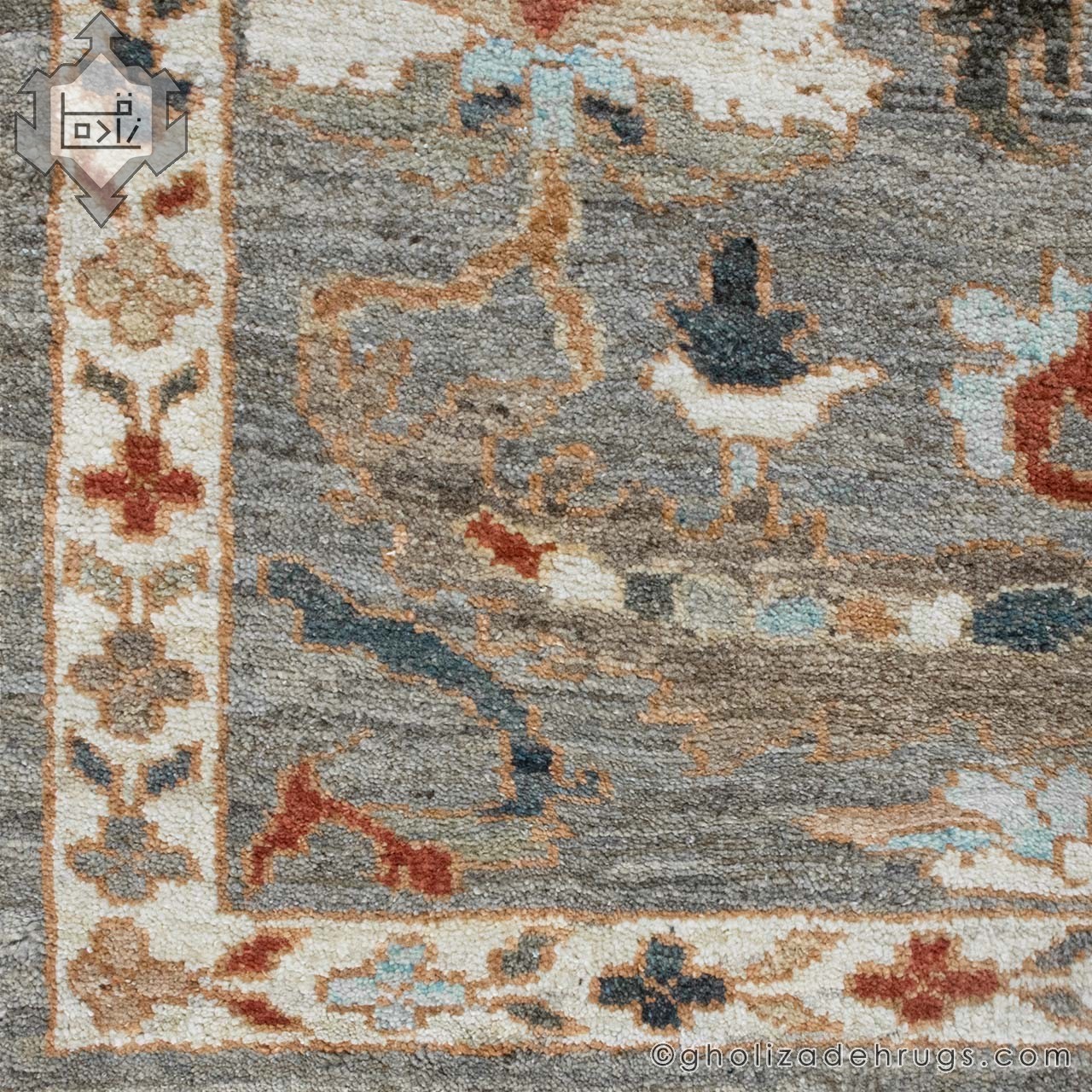 This four-square-meter handwoven Sultanabad rug (Code SA590) features a soft gray background accented by a slim blue-cream border, offering a clean and balanced design.
