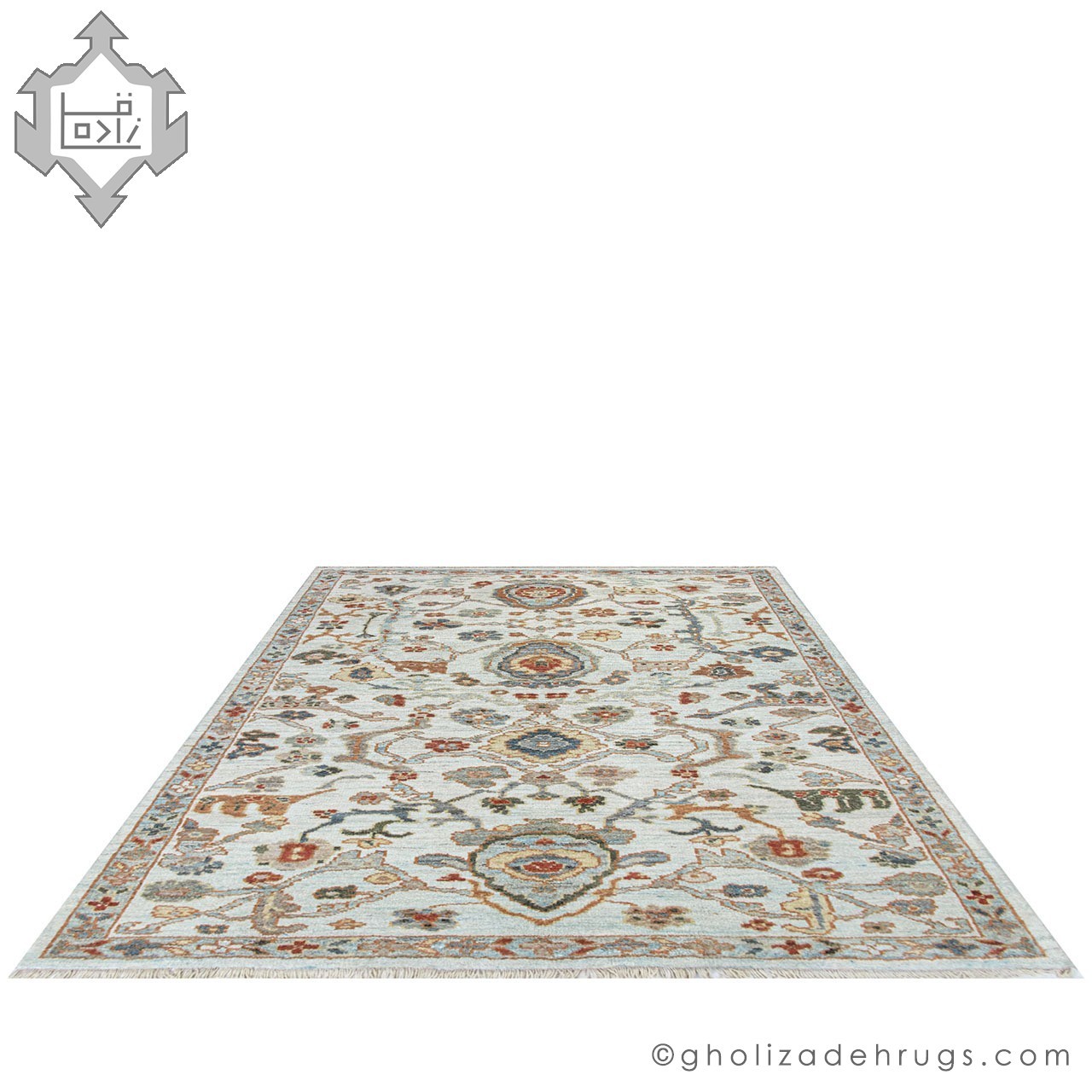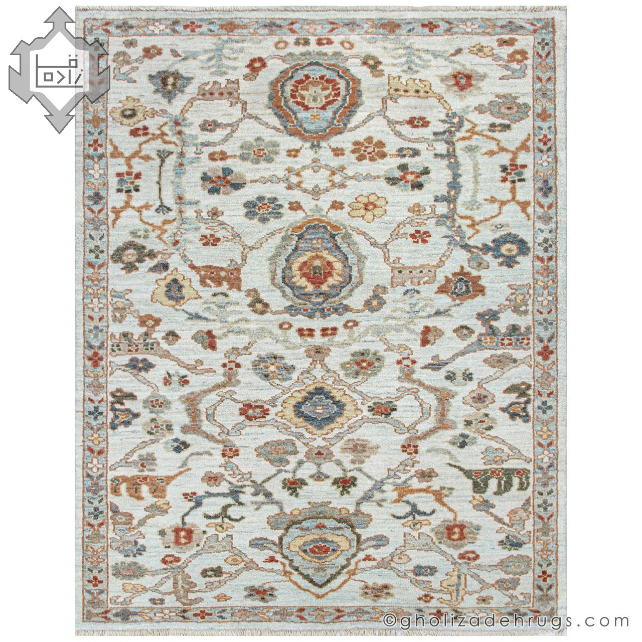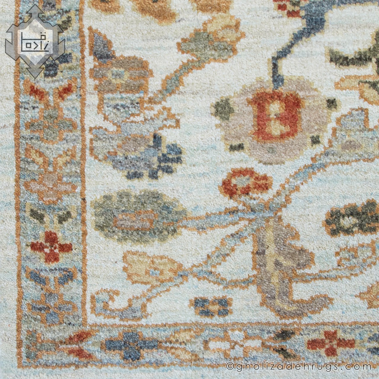 The cream-colored field creates a bright and serene foundation, while the soft blue accents introduce gentle contrast and visual depth without overpowering the composition. This restrained color palette is a hallmark of Sultanabad rugs, making them highly versatile and enduring.