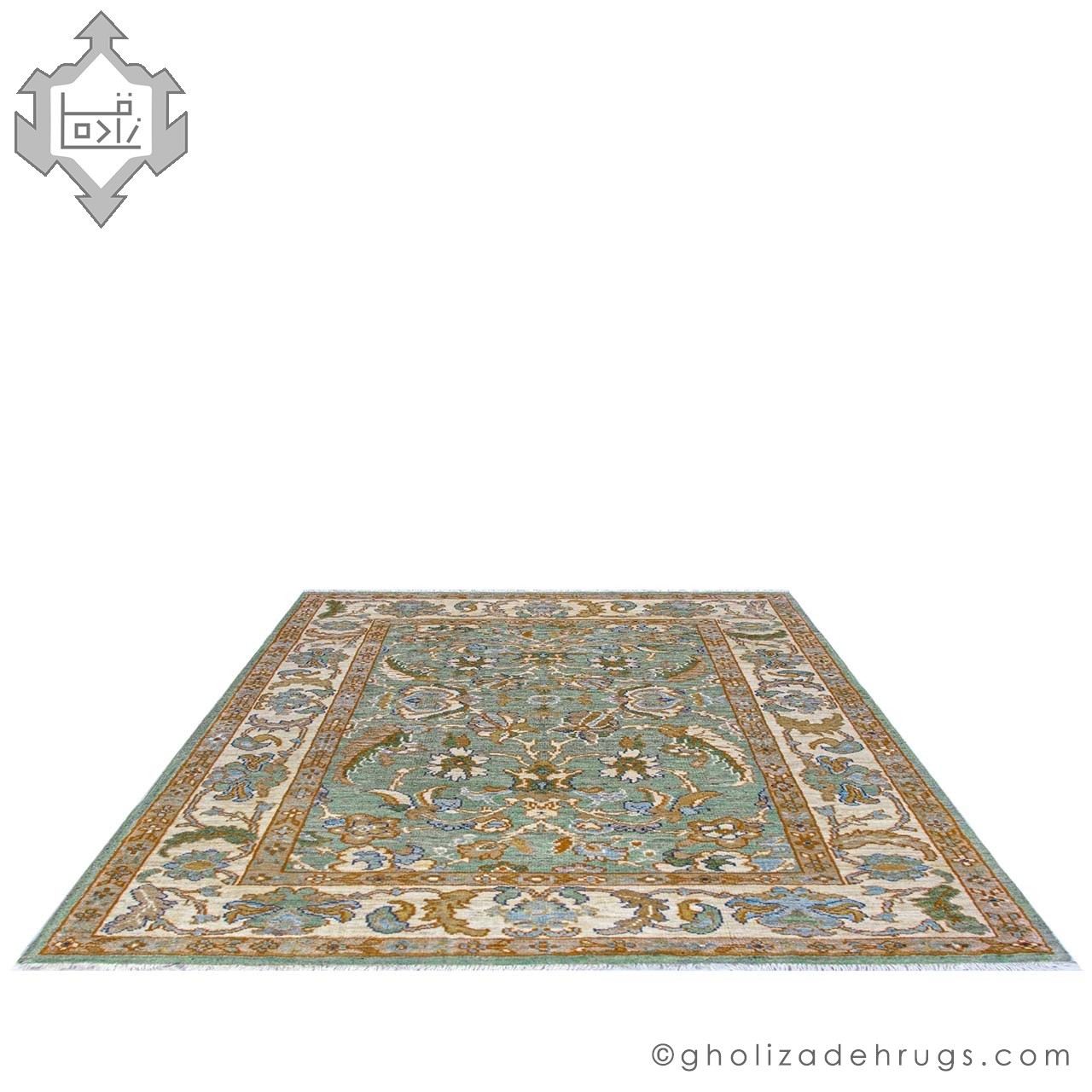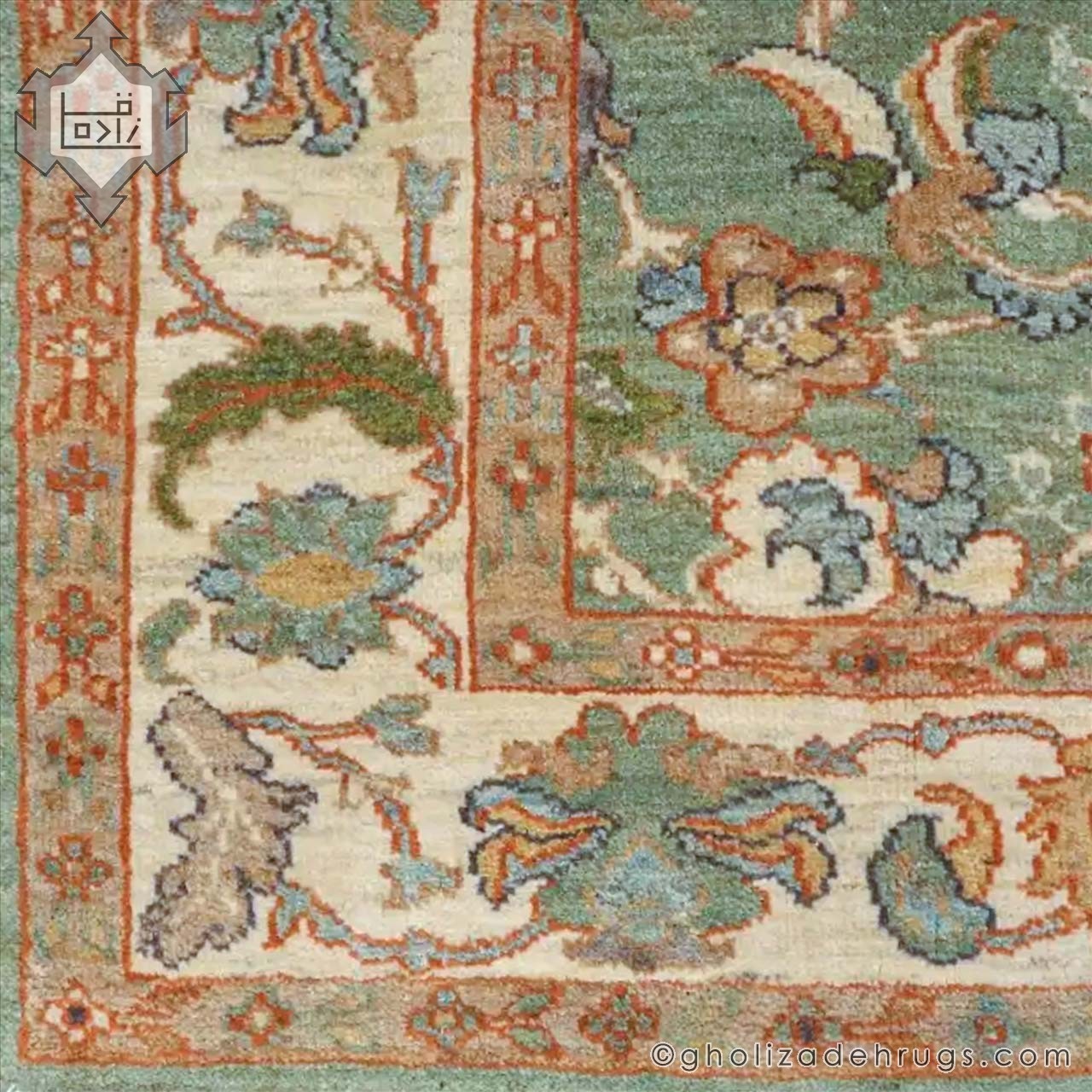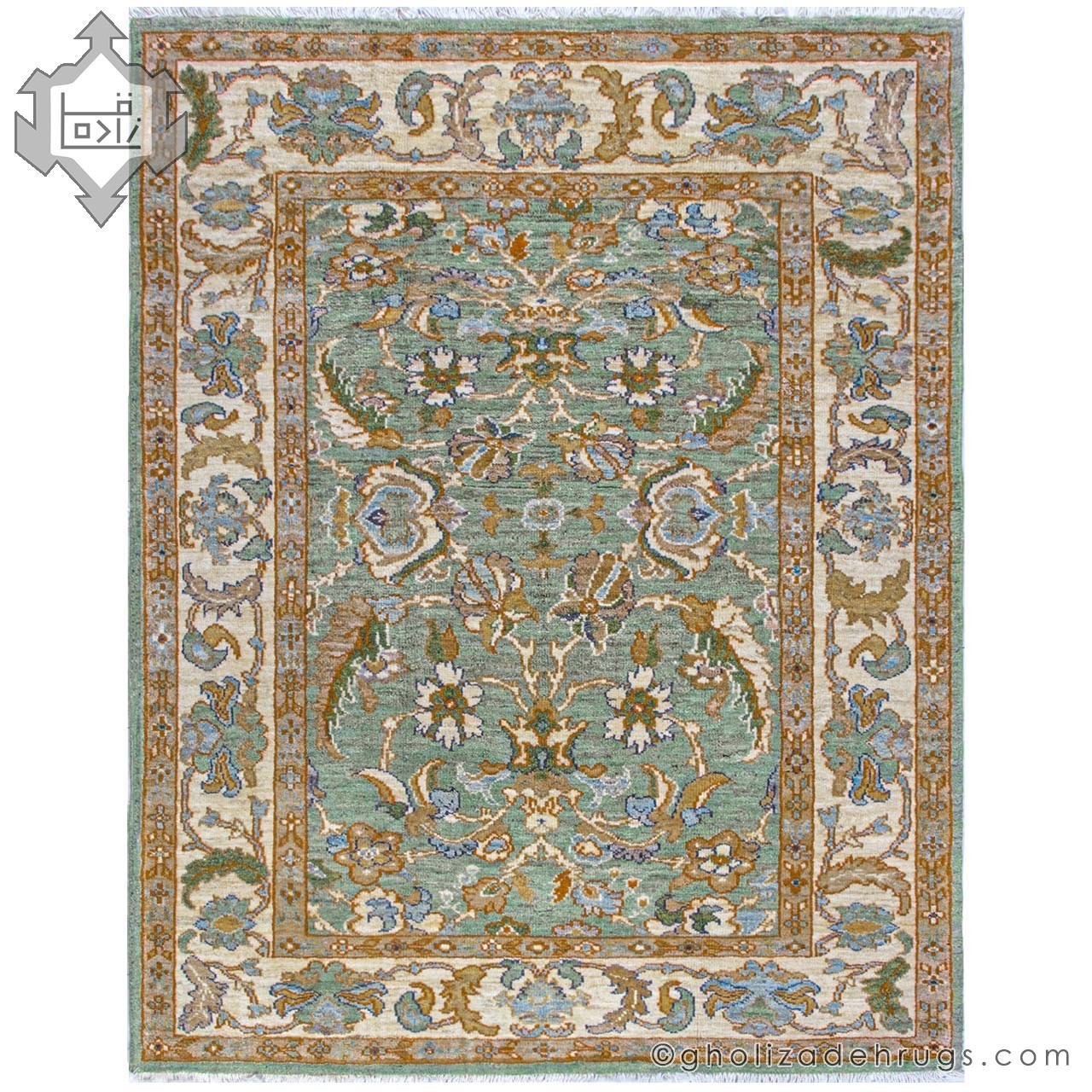 This authentic handwoven Sultanabad rug showcases a delicate sky-blue background framed by a warm cream border, bringing a sense of clarity and tranquility to the space. The subtle contrast between the cool blue field and the neutral cream border creates a harmonious and elegant look that integrates effortlessly with a wide range of interior styles.