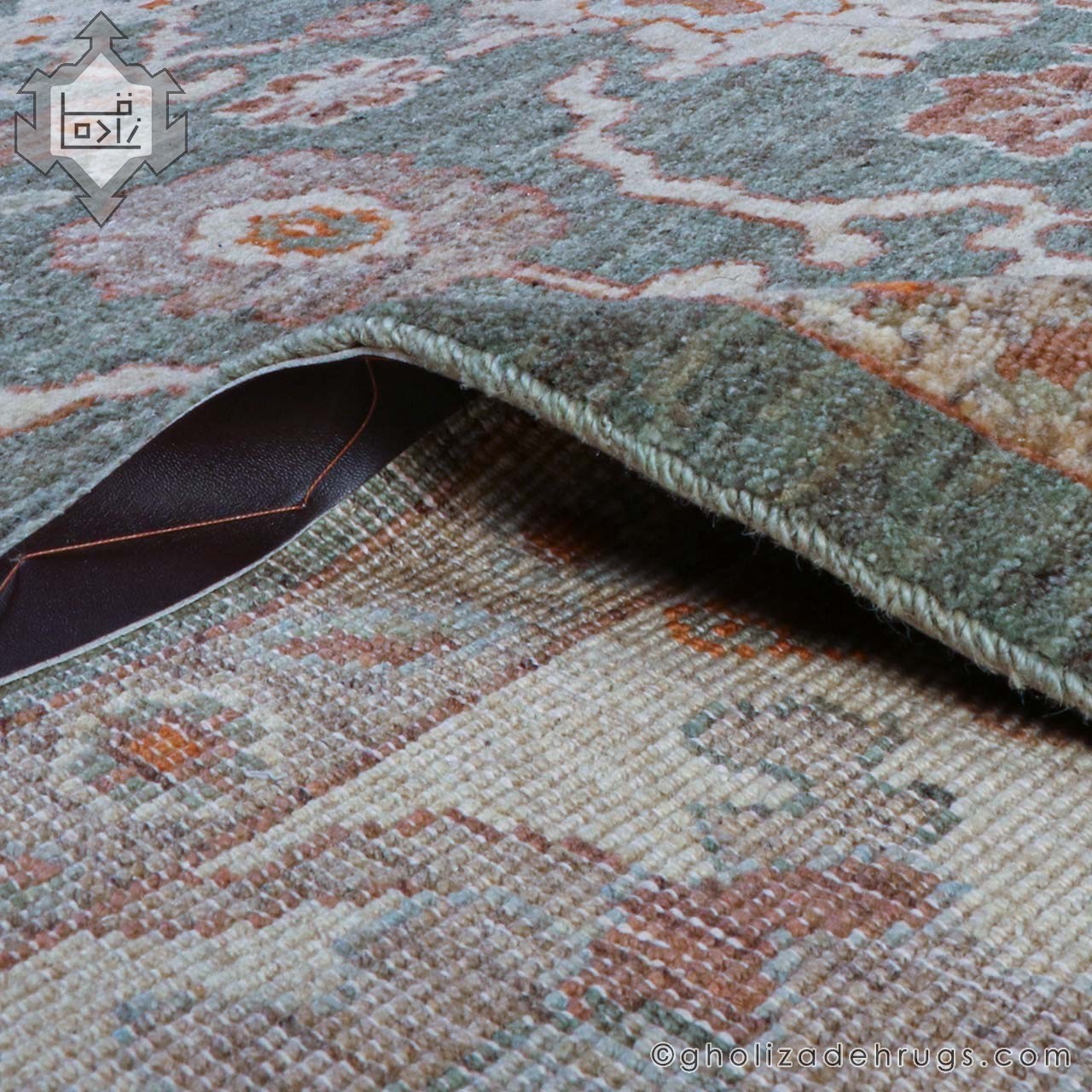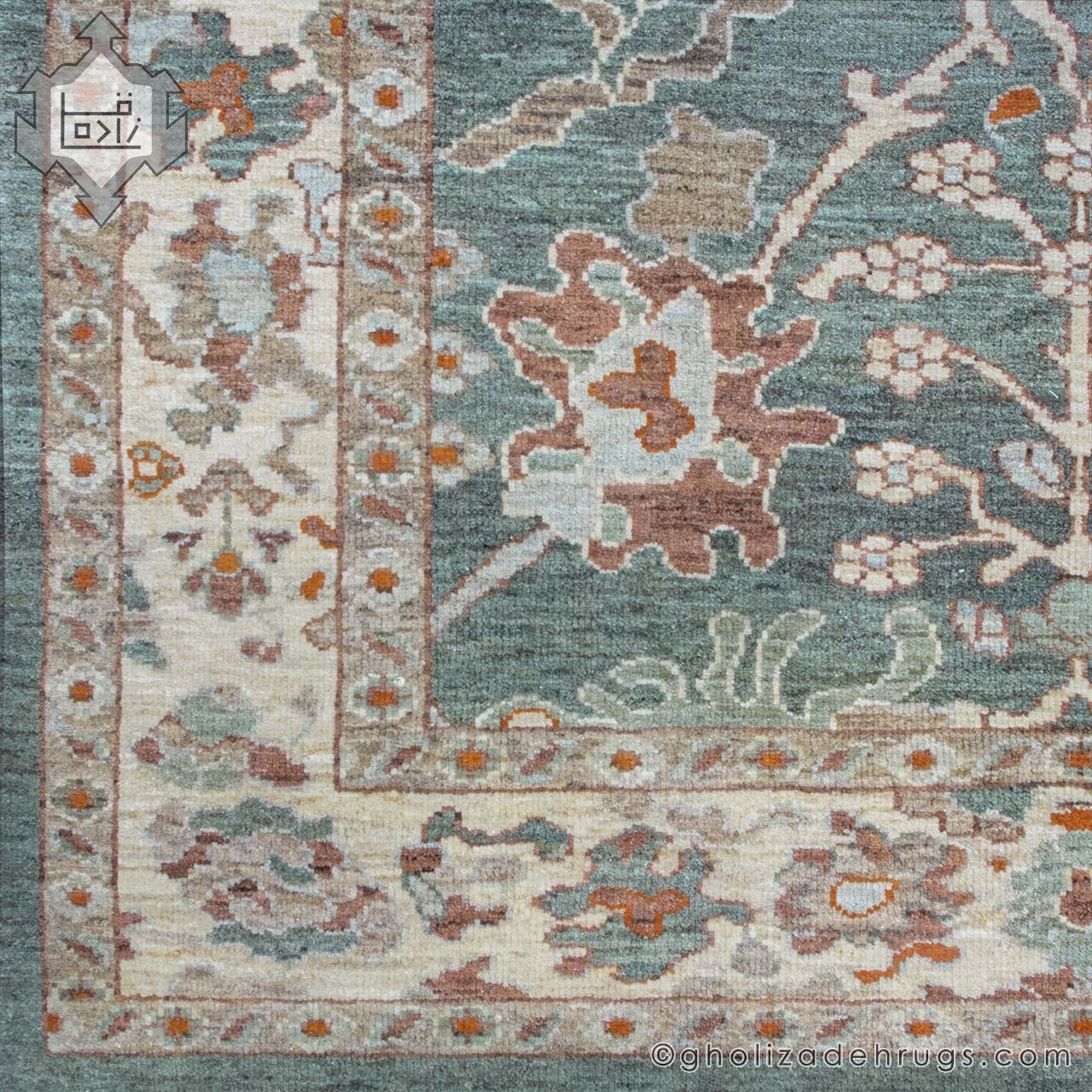 این فرش دستبافت زیبا از مجموعهی سلطانآباد با زمینه سبز ملایم و حاشیه کرم روشن، جلوهای از هماهنگی رنگ و اصالت ایرانی را به نمایش میگذارد.