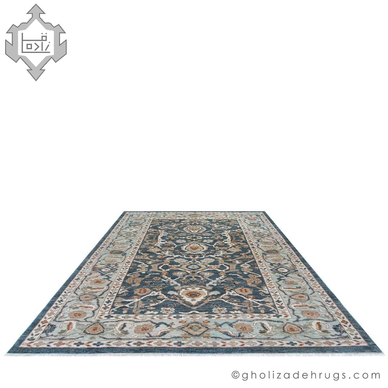 این فرش دستبافت سلطانآباد نمونهای اصیل از قالیهای منطقه اراک است که با زمینه سرمهای تیره و حاشیه آبی بافته شده است. رنگ سرمهای عمیق، به قالی وقار و عمق بصری میبخشد و باعث میشود نقوش گلدار با وضوح و جلوه بیشتری دیده شوند. گلها در زمینه سرمهای حضوری برجستهتر دارند و ظرافت طراحی را بهخوبی نمایش میدهند.