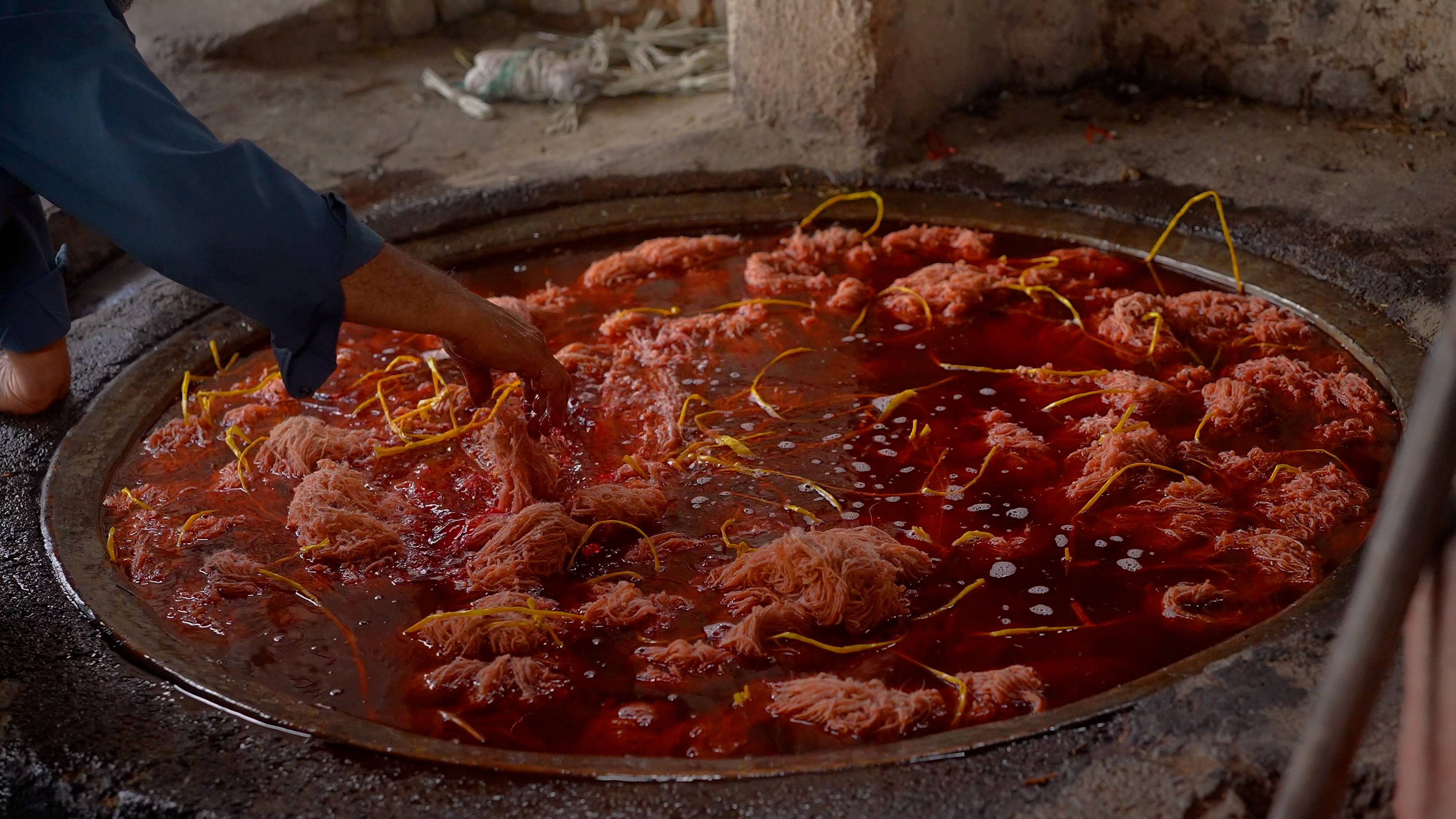 در تصاویر میبینید که رشتههای زرد در کنار نخهای پشمی در حال رنگ گرفتناند.